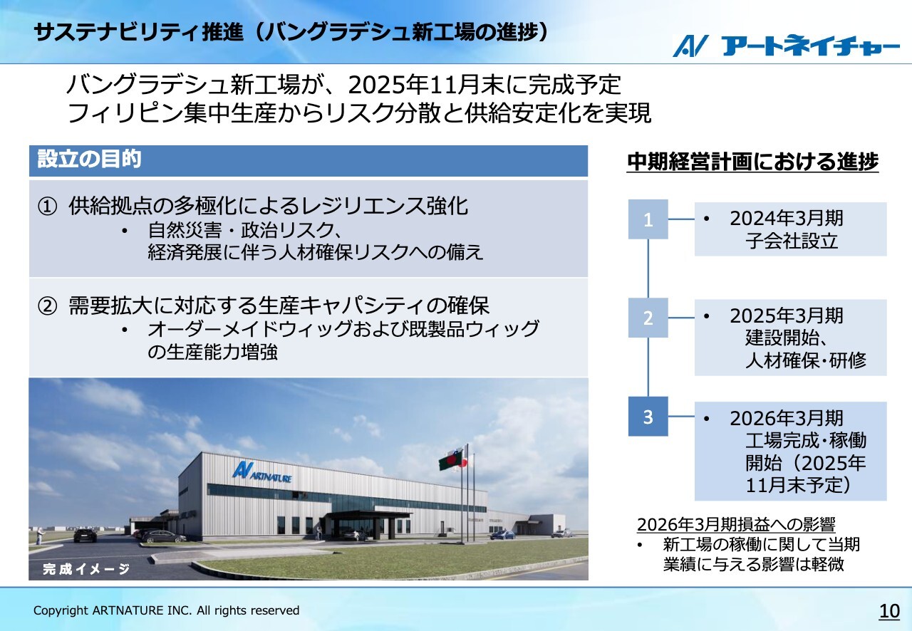 生産リスクの分散および生産能力の拡大を目的として、現在バングラデシュに新工場を建設中ですが、11月末に完成予定となっています。