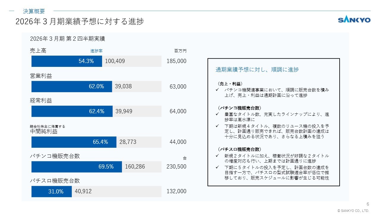 通期計画に対する第2四半期までの進捗状況についてご説明します。まず、売上および利益面では、パチンコ機関連事業において新規タイアップ機を中心に販売し、販売台数、販売単価ともに堅調に推移したことから、通期業績予想に対して順調な進捗を示しています。