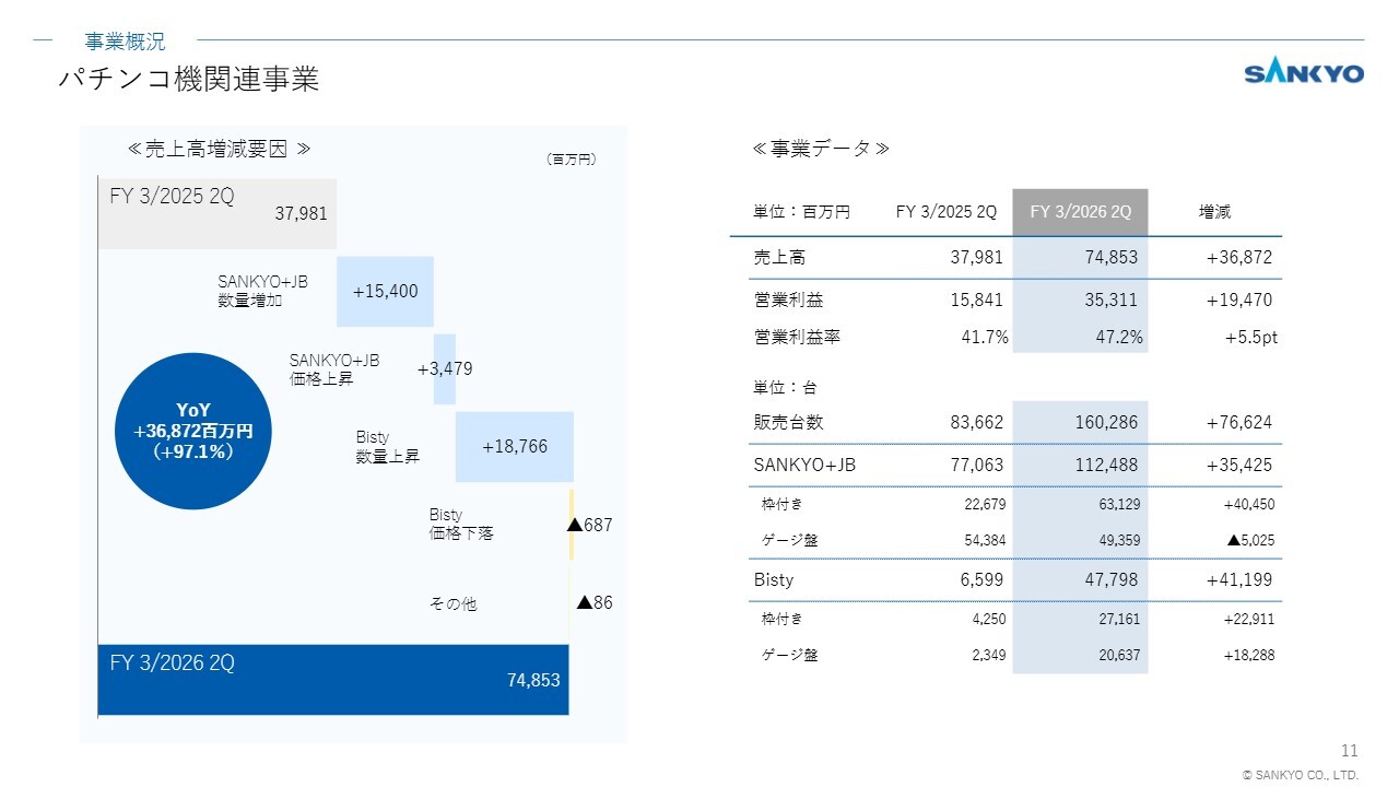 事業の概況です。パチンコ機関連事業の売上高増減要因として、SANKYOおよびBistyブランドの数量増加の効果に加え、セールスミックスの影響でSANKYOブランドの販売単価が上昇したことが挙げられます。