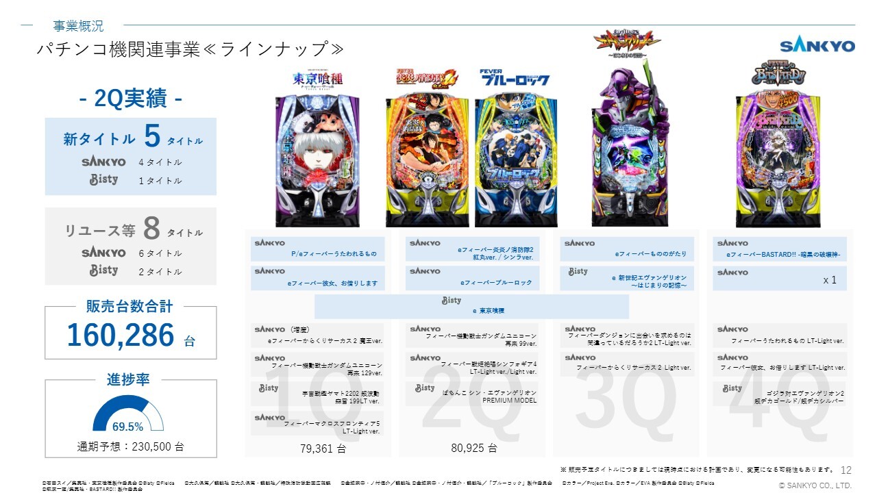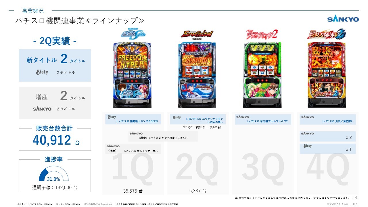 一方、パチスロ機の販売台数については、上期までに新規2タイトルを販売し、稼働が好調な2タイトルの増産を実施しました。ただし、下期に販売タイトルが集中しているため、現時点で通期計画に対する進捗率は低い水準にとどまっています。