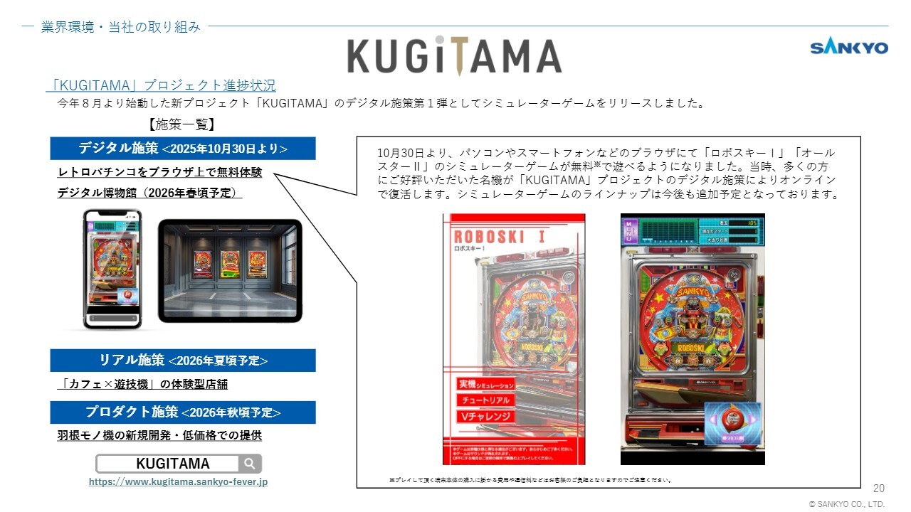 また今後のデジタル施策として、シミュレータゲームのラインナップの充実に加え、当社やパチンコ業界の歴史や文化を学べるデジタル博物館の展開も予定しています。引き続き、「KUGITAMA」プロジェクトの動向にご注目ください。