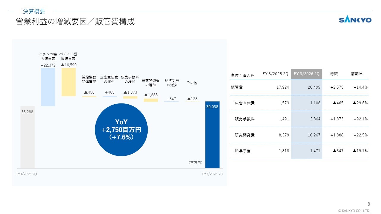 一方で、販管費は25億7,500万円増加しています。主な要因として、ビスティブランドのパチンコ機の販売が好調に推移し、販売手数料が13億7,300万円増加したことに加え、パチンコ機・パチスロ機のラインナップ充実やクオリティ向上を継続して推進していることから、研究開発費が18億8,800万円増加したことが挙げられます。