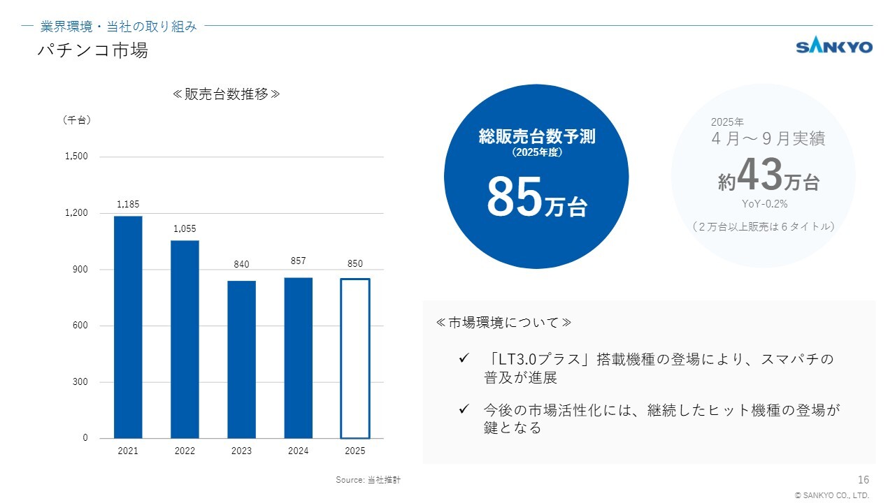 セグメント別に総括します。まずパチンコ市場においては、「ラッキートリガー3.0プラス(以下、LT3.0プラス)」搭載機種の登場によりスマパチの普及が進展し、好調に稼働している機種が市場の活性化に明るい兆しをもたらしています。