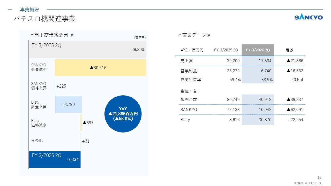 パチスロ機関連事業の売上高増減要因です。SANKYOブランドの販売数量が減少した影響が大きく、前年同期比で減収となっています。