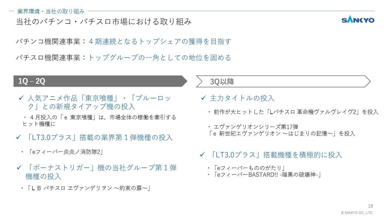 下期においては、パチンコでは主力タイトルの導入に加え、引き続き「LT3.0プラス」搭載機種を積極的に展開していきます。