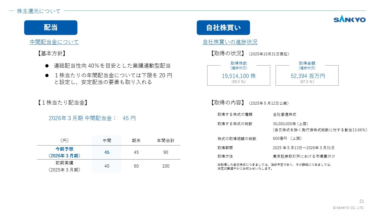 最後に、株主還元についてご説明します。中間配当は1株当たり45円と決定しており、期末配当予想も45円を予定しています。これにより、年間配当は90円となる見込みです。
