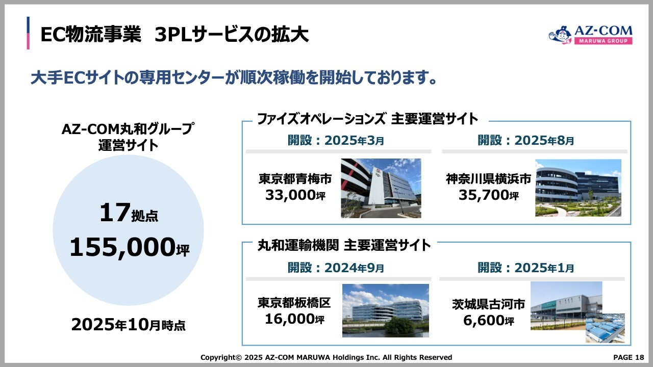 現在、当社グループの拠点は17拠点です。これは物流センターの拠点数を指し、合計面積は15万5,000坪となります。スライド右側上段の画像は、先ほどファイズホールディングス株式会社の大澤社長が説明されていた、東京都青梅市の3万3,000坪と、神奈川県横浜市の3万5,700坪のセンターを示しています。これらは同社でも最大規模のセンターです。