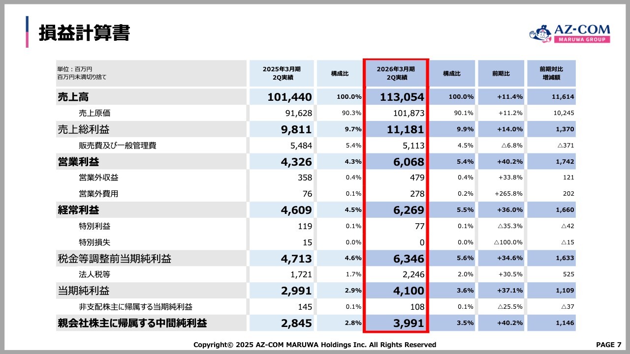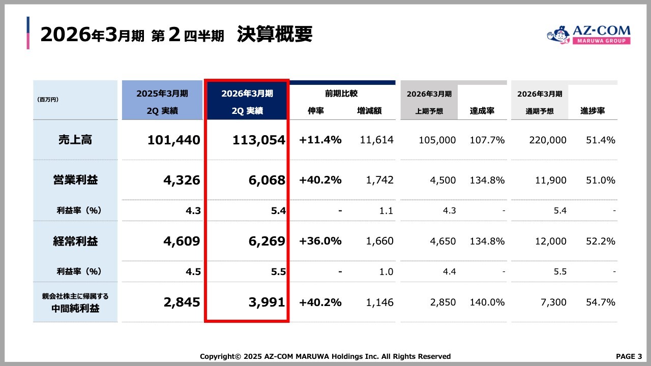 2026年3月期第2四半期の業績について、売上高は1,130億5,400万円で、前期比11.4パーセント増、中間期における進捗率は51.4パーセントでした。営業利益は60億6,800万円で、前期比プラス40.2パーセント、進捗率は51.0パーセントとなっています。