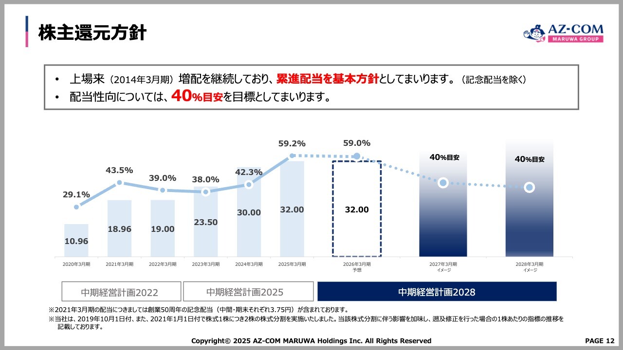 株主還元方針です。当社は2014年の上場以来、増配を継続しています。また、先般開示したとおり、累進配当を基本方針に掲げています。配当性向は40パーセントを目安としており、今期は1株あたり16円、配当性向は59パーセントとなっています。今後も累進配当制度のもと、安定的な増配を着実に達成していきたいと考えています。