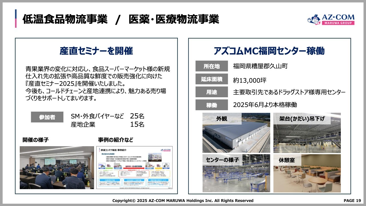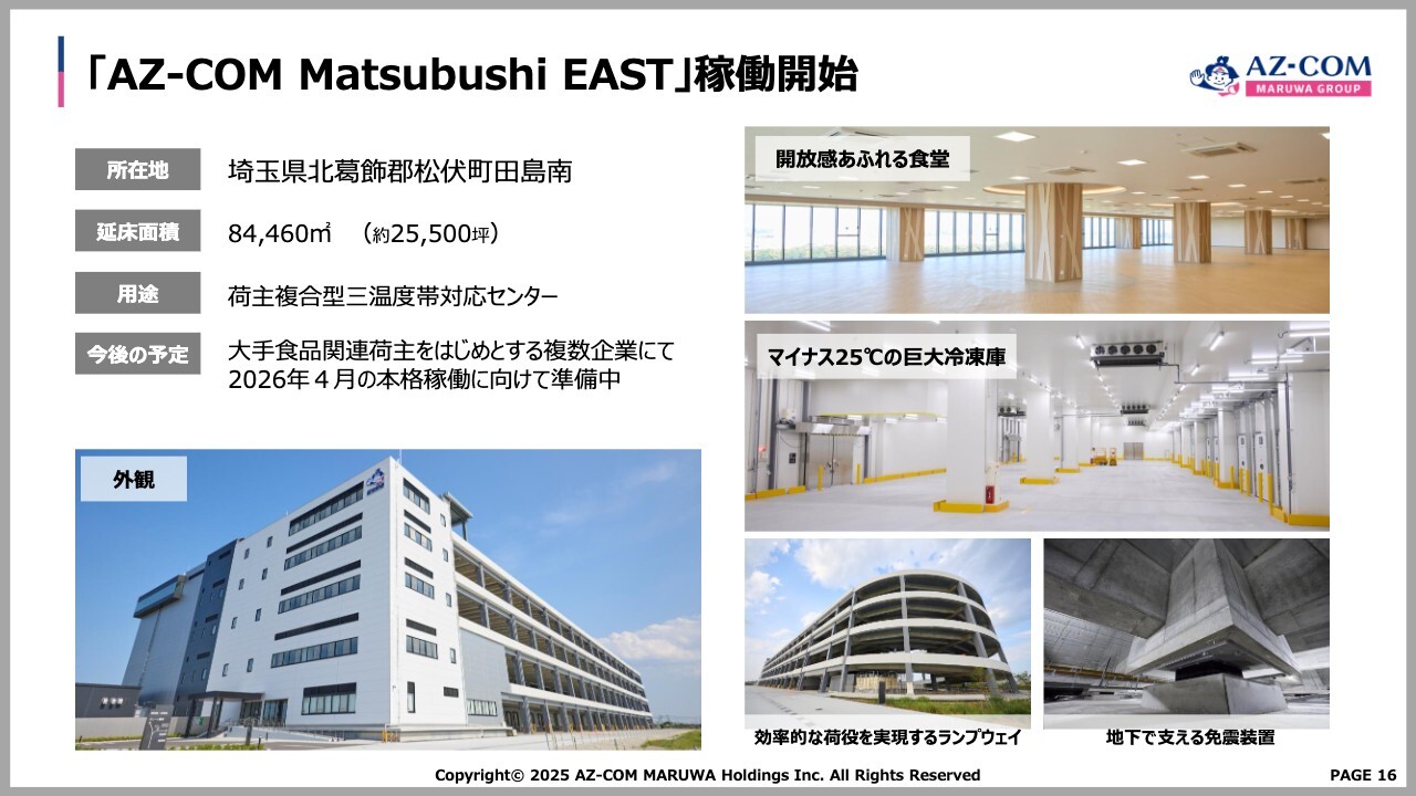 和佐見:「AZ-COM Matsubushi EAST」に関するクライアントの状況についてのご質問ですね。まず、常温物流および冷凍・冷蔵物流についてですが、本格的な稼働開始は来年4月となります。4月からの稼働となる理由は、お客さまのご都合によるもので、新年度から稼働を希望されているためです。