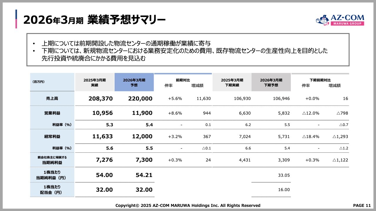 2026年3月期の業績予想です。我々は前期および今期の中間期において、大幅な増収増益を達成しました。通期についてはスライドに記載のとおり、下期における新規物流センターの業務安定化にかかる費用、既存センターの生産性向上を目的とした先行投資、統廃合に伴う費用などを織り込んでいます。