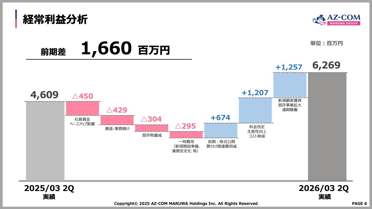 次に、料金改定や生産性向上によりプラス12億700万円、さらに、新規顧客の獲得や既存事業の通期稼働などでプラス12億5,700万円となりました。結果として、経常利益は前期の46億900万円から、この中間期では62億6,900万円となっています。