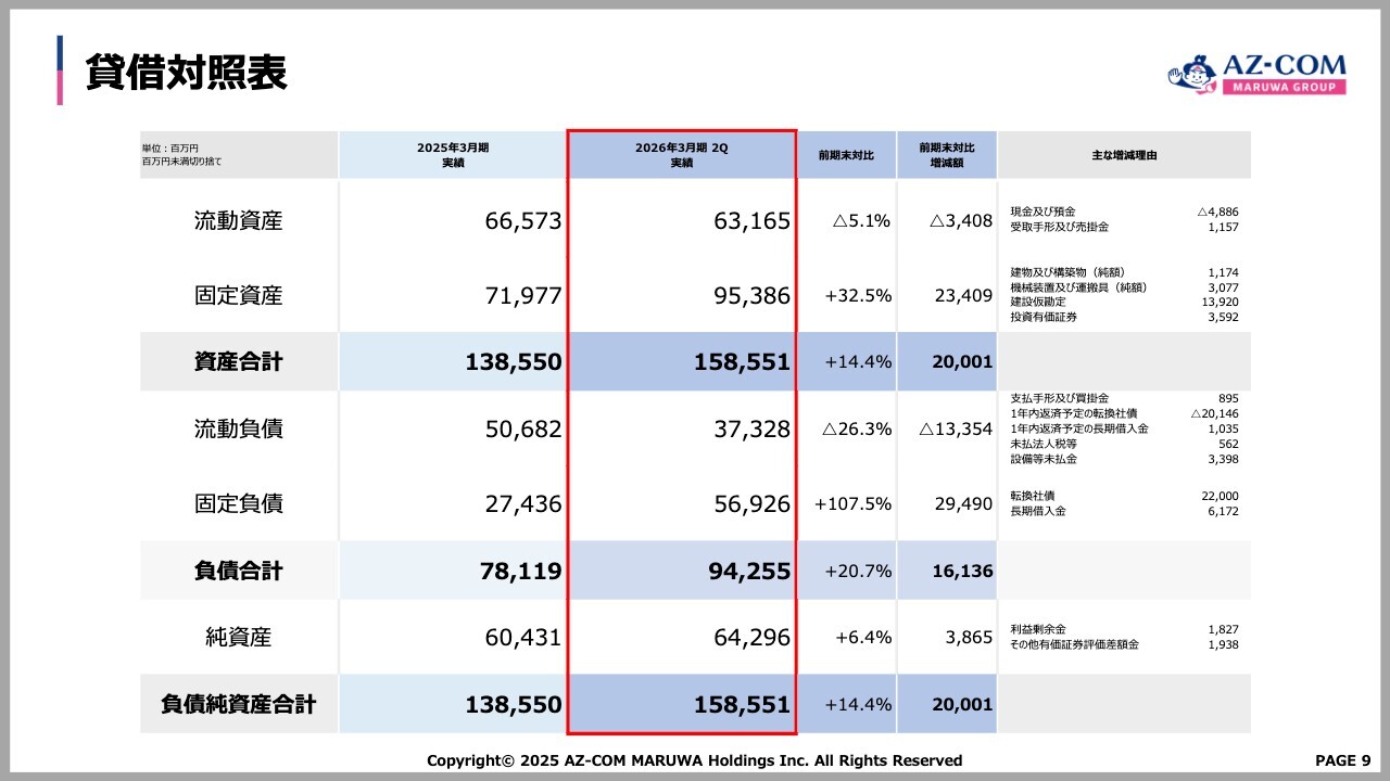 貸借対照表です。特筆すべき点として、建設仮勘定が139億2,000万円増加しています。これは埼玉県松伏町に新たに建設中の大型施設「AZ-COM Matsubushi」の第1期工事に係る建設仮勘定です。