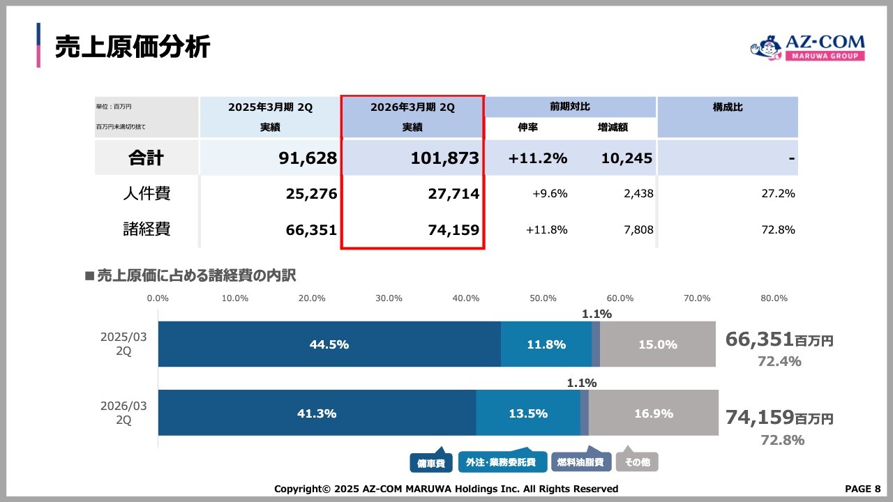 進捗率についてもご説明しましたが、下期の割合は平均すると過去10年間でおおよそ45パーセント対55パーセントとなっており、スケールメリットの観点から下期偏重型の傾向が見られます。当社「AZ-COM丸和グループ」もこのような構造になっています。ただし、各センターの統廃合や生産性向上のためのさまざまな投資などにより、2026年3月期については取締役会等でも多く議論されました。