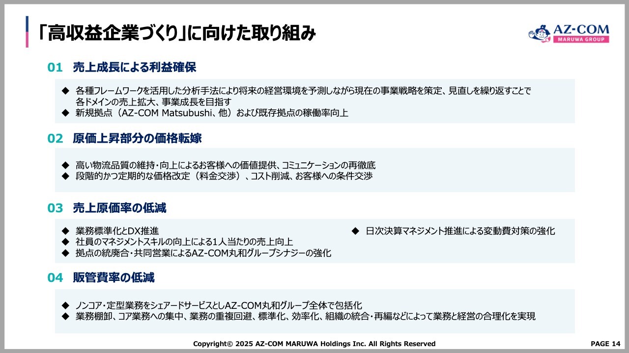 具体的な取り組みは4つあります。1つ目は「売上成長による利益確保」として、新規のお客さまの獲得に向けて取り組みました。車両や人手の不足といった課題がある中での新規開発は難しいものですが、あえて新規顧客の開拓を目指し、努力してきました。