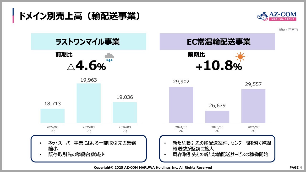 各ドメイン別の売上高をご説明します。まず、ラストワンマイル事業は前期比マイナス4.6パーセントと低調な結果となりました。スライドに雨模様のイラストで示しているとおりです。これは、大手GMSのお客さまがネットスーパーの宅配事業から撤退したことが影響しています。この結果、2025年3月期第2四半期と比較すると、売上高は199億6,300万円から190億3,600万円へ減少しました。