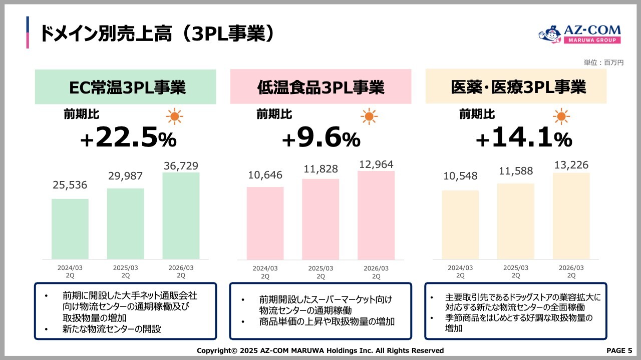 低温食品3PL事業は、前期比プラス9.6パーセントの成長となりました。前期に開設したスーパーマーケット向け物流センターの通期稼働に加え、食品等の物価上昇に伴う単価の上昇や取扱物量の増加が寄与し、伸びています。