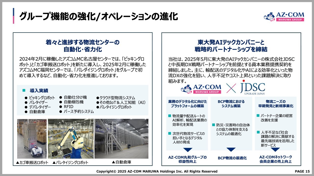 グループ機能の強化とオペレーションの進化についてです。どの企業も同じ状況にありますが、我々も人手不足への対応が課題でした。その答えとして、自動化やロボット化が必要不可欠です。ただし、これには投資が伴います。