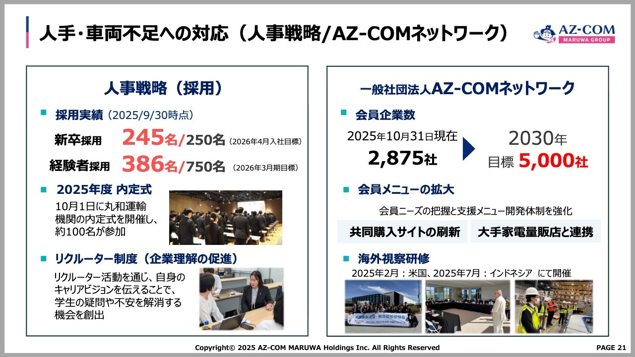また、一般社団法人AZ-COMネットワークは、2025年10月31日時点で会員企業数2,875社となっており、今期で3,000社を目指しています。さらに、2030年には5,000社、2040年には1万社を目標としています。会員のみなさまが、あらゆる物流におけるローコストオペレーションの仕組みを作るにはどうすればよいかを常に模索し、勉強会を開催しています。