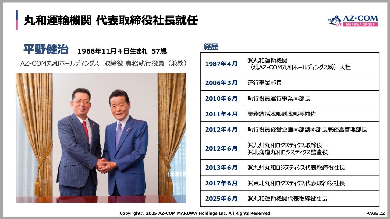 みなさま、スライドの写真をご覧ください。この写真の人物は平野健治さんで、株式会社丸和運輸機関の新社長です。前社長は私で、社長交代となりました。本日、ここに来ているため、決算説明会が終わった後、みなさまがお帰りになる前にご紹介します。どうぞ楽しみにしていてください。