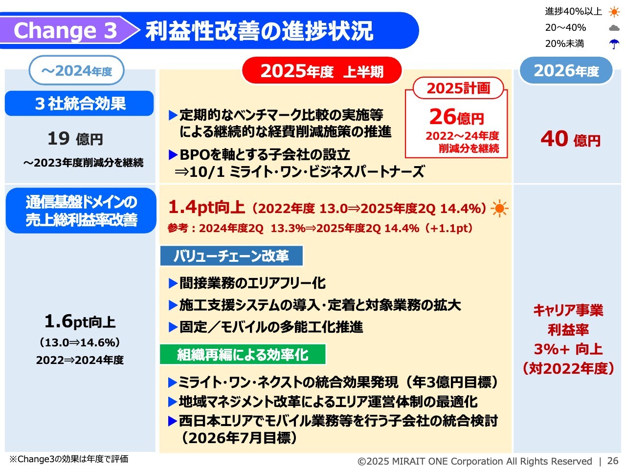 「Change 3」利益性トップクラスを目指した取り組みの進捗についてです。2022年7月に行われた3社統合の効果については、グループ内でのベンチマーク比較などの取り組みを継続し、年間目標の達成を目指しています。