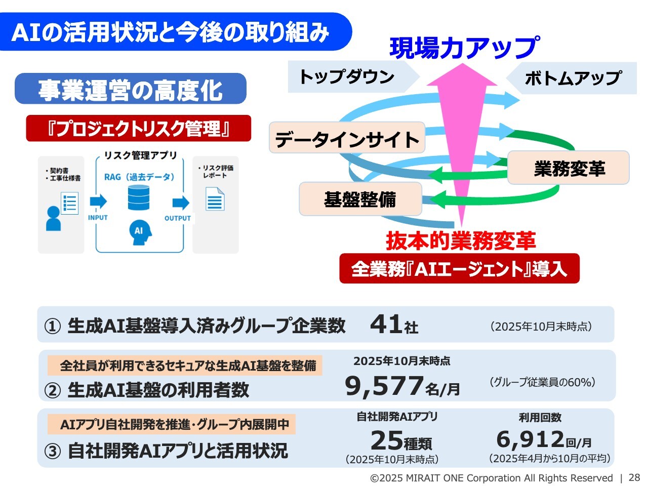 生成AIの活用においては、プロジェクトリスク管理のアプリなどを開発し、受注案件のリスク評価を行うことで、不採算案件の発生を抑制しています。このように、自社で開発した25種類のアプリが月間6,912回利用されており、現場力アップに貢献しています。