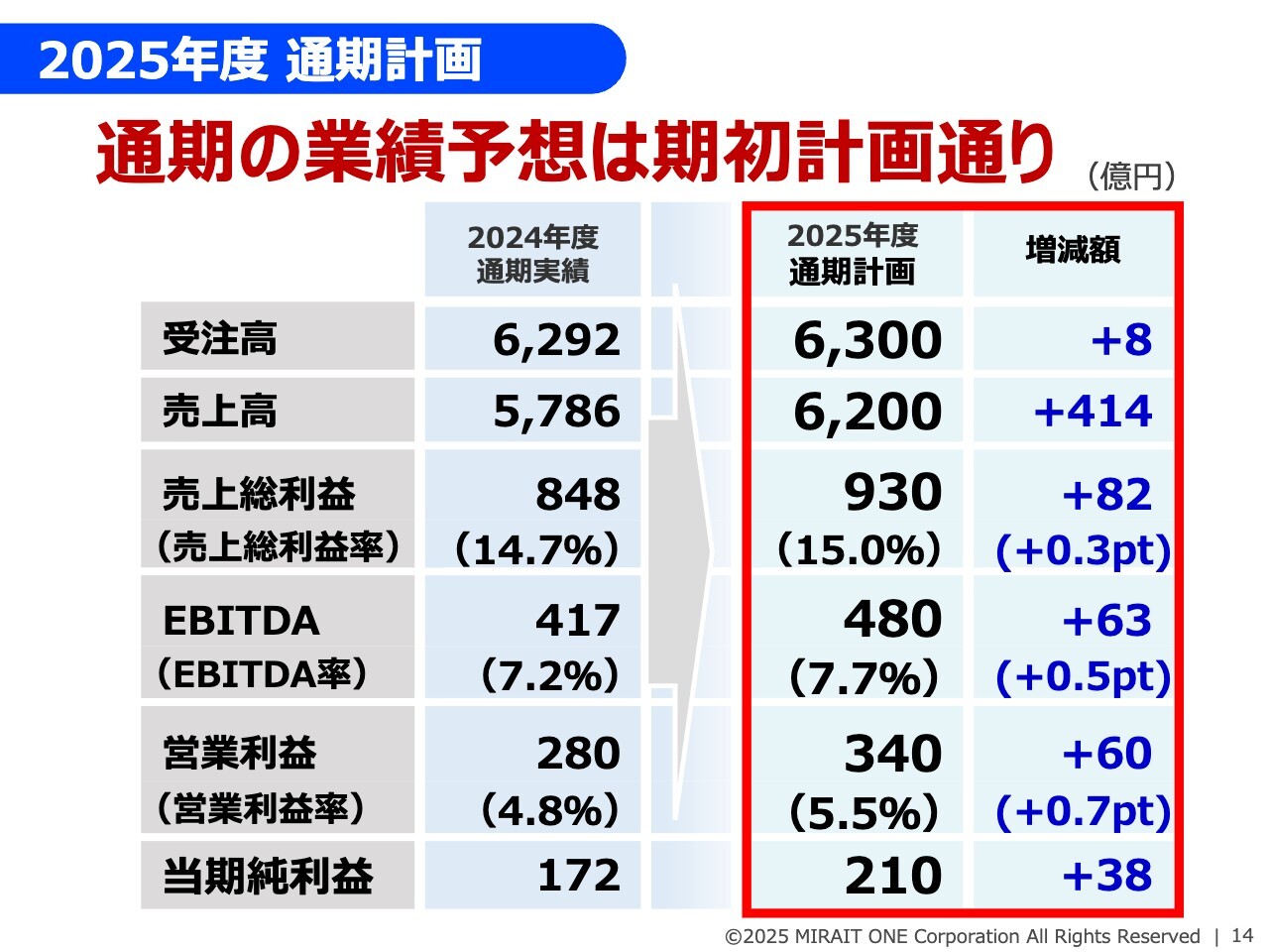 2025年度の通期計画についてです。上期においては、ご説明したとおり順調に業績を計上しています。したがって業績予想は変更せず、受注高6,300億円、売上高6,200億円、EBITDA 480億円(EBITDA率7.7パーセント)、営業利益340億円(営業利益率5.5パーセント)、当期純利益210億円の達成に向けて、引き続き事業運営に努めていきます。