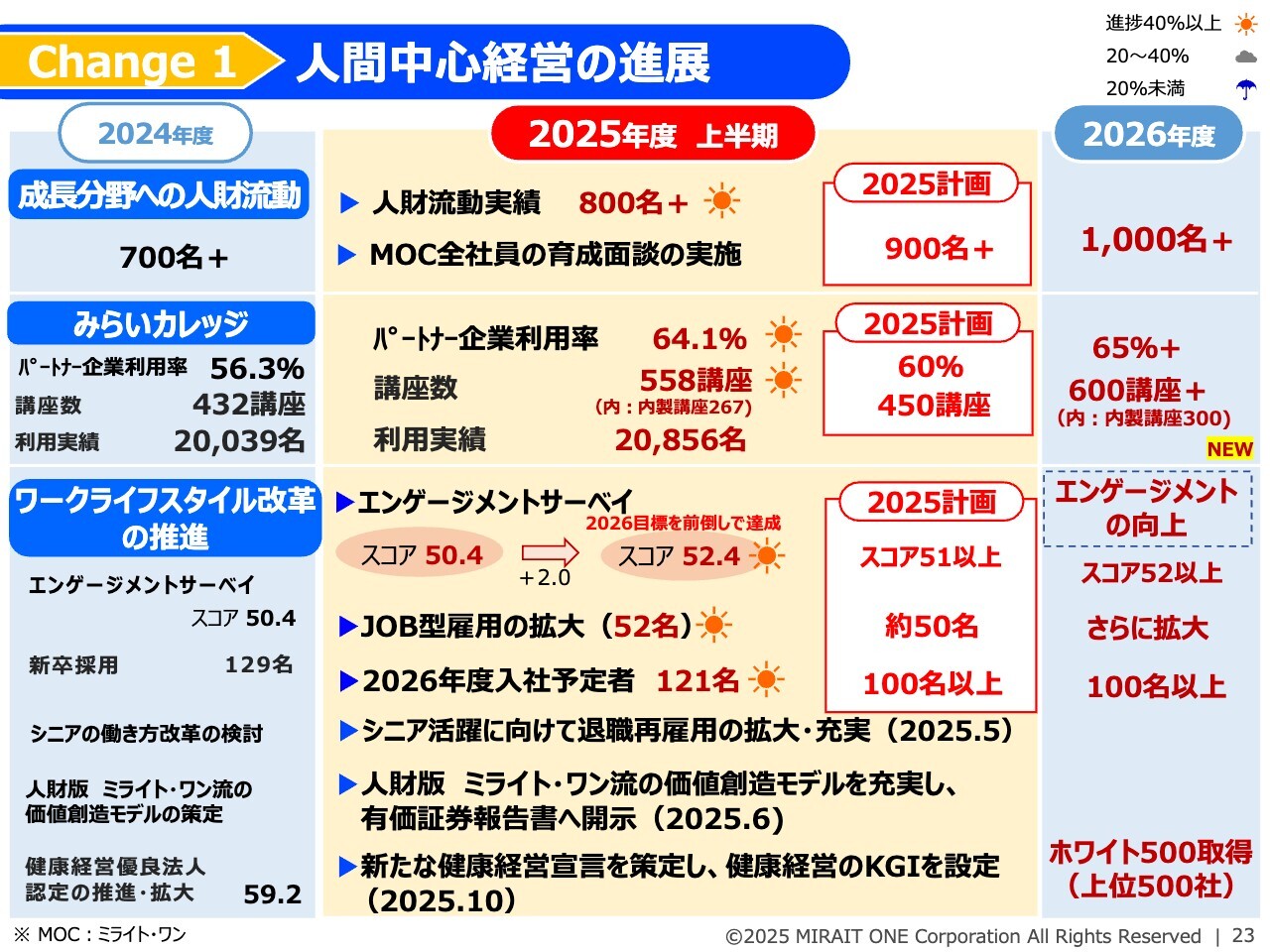 また、「みらいカレッジ」の利用率やエンゲージメントサーベイのスコアアップ、来年度の入社予定者などについては、期初に設定した計画を達成するなど、着実に進展しています。