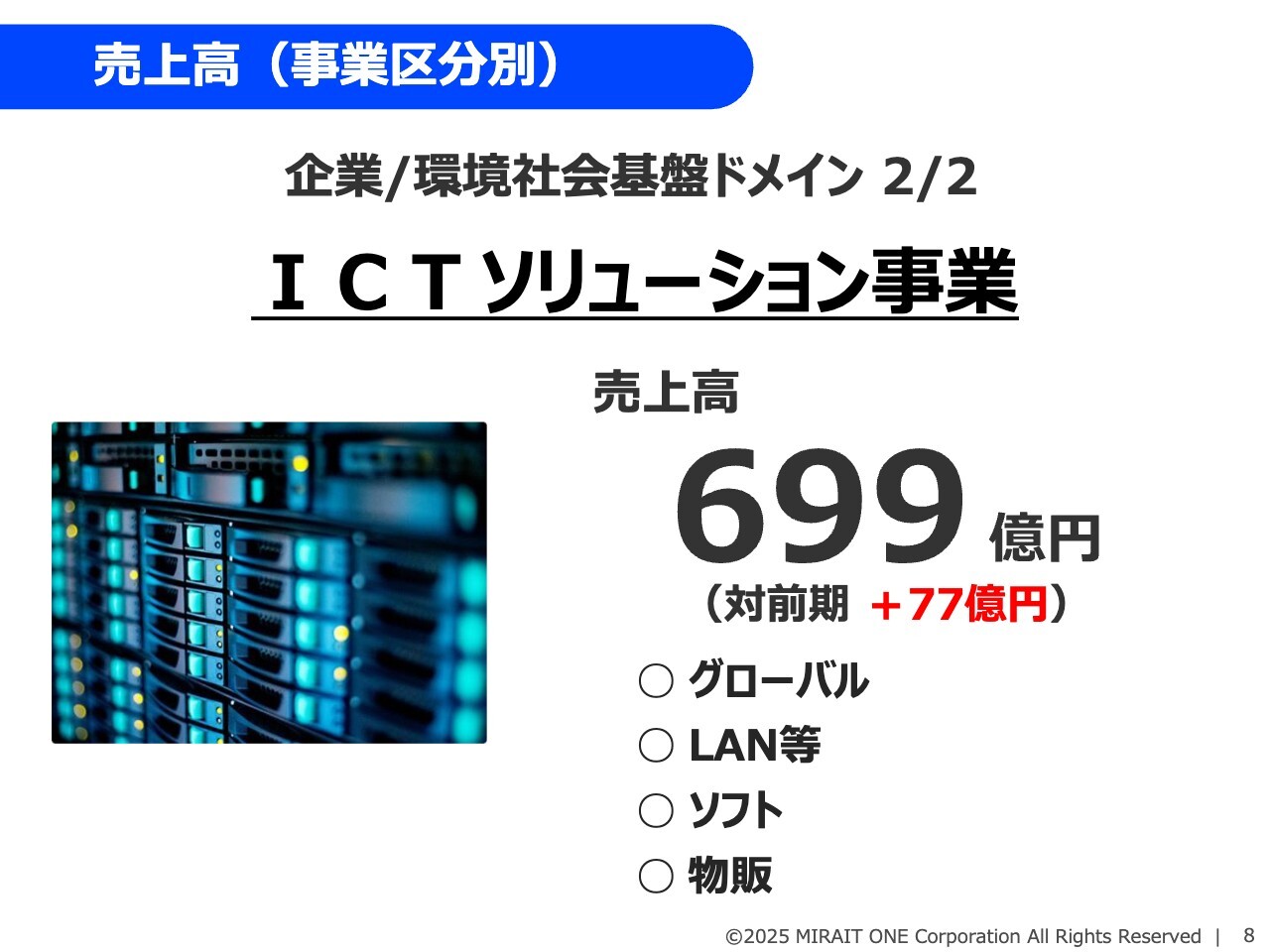 ICTソリューション事業についてです。売上は前年比77億円増の699億円となりました。内訳としては、グローバルではデータセンタのケーブリング事業を行っている子会社のラントロビジョンが好調であるほか、LAN等やソフトも増収、物販ではNEXT GIGAスクールが大きく伸びています。