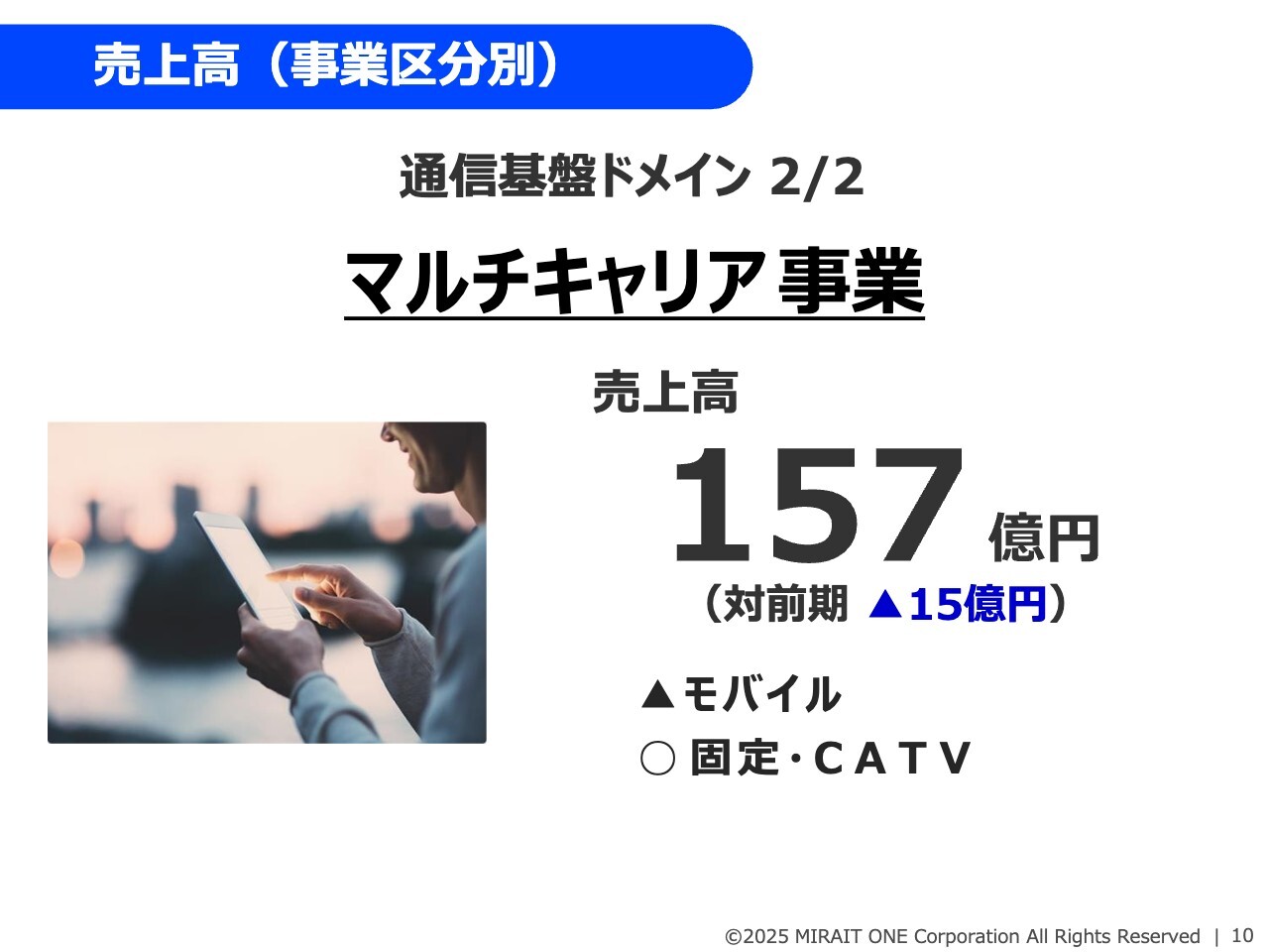 マルチキャリア事業についてです。通信キャリア会社ごとに濃淡はあるものの、前年度から続く受注減の影響を受け、5G基地局整備関連は減少しました。一方で、固定・CATV関連は増加しましたが、トータルでは前年比15億円減の157億円にとどまりました。