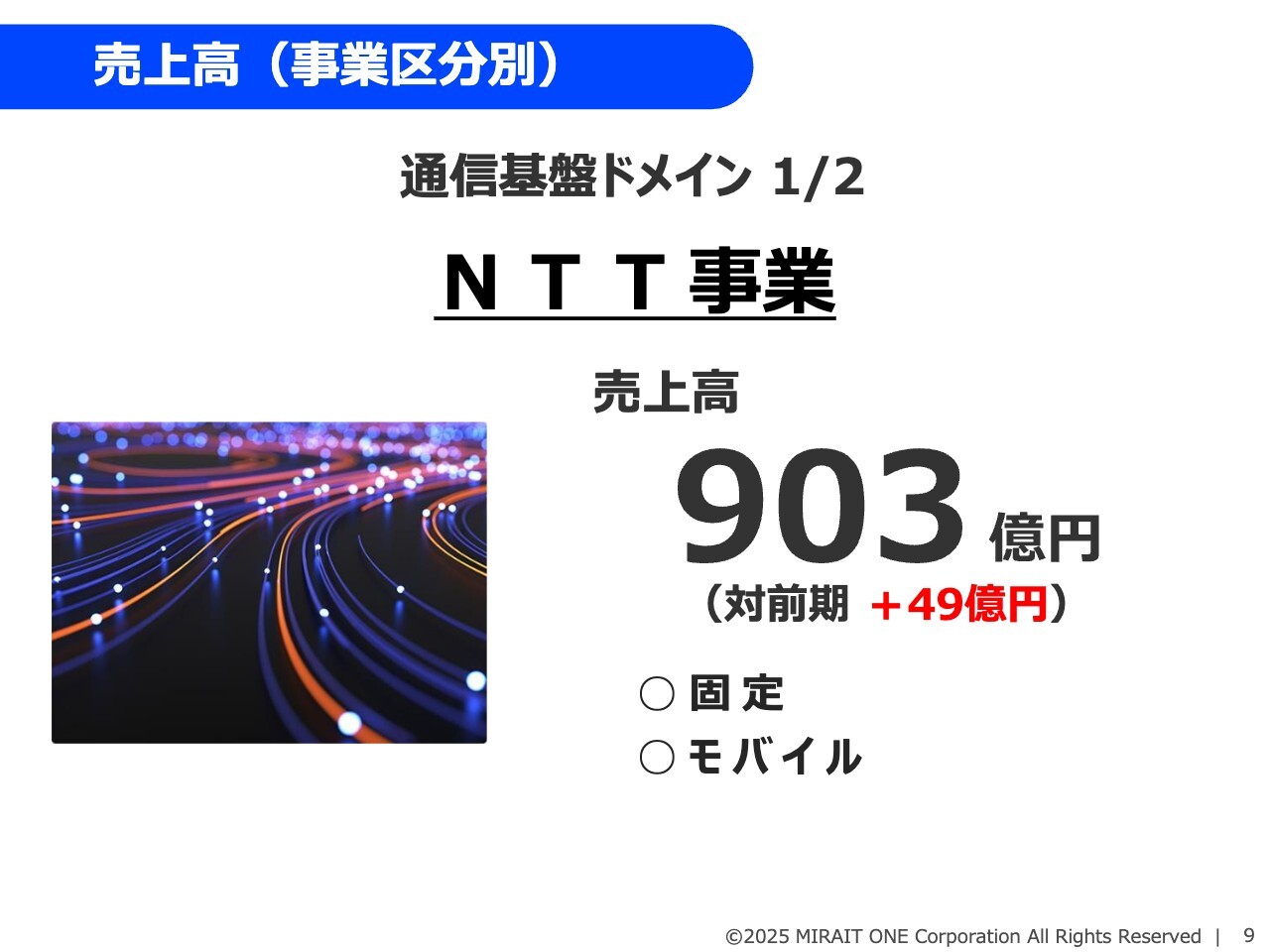 NTT事業についてです。固定関連が増加したほか、モバイルでは引き続き5Gの品質改善投資が伸びたことにより、前年比49億円増の903億円となりました。