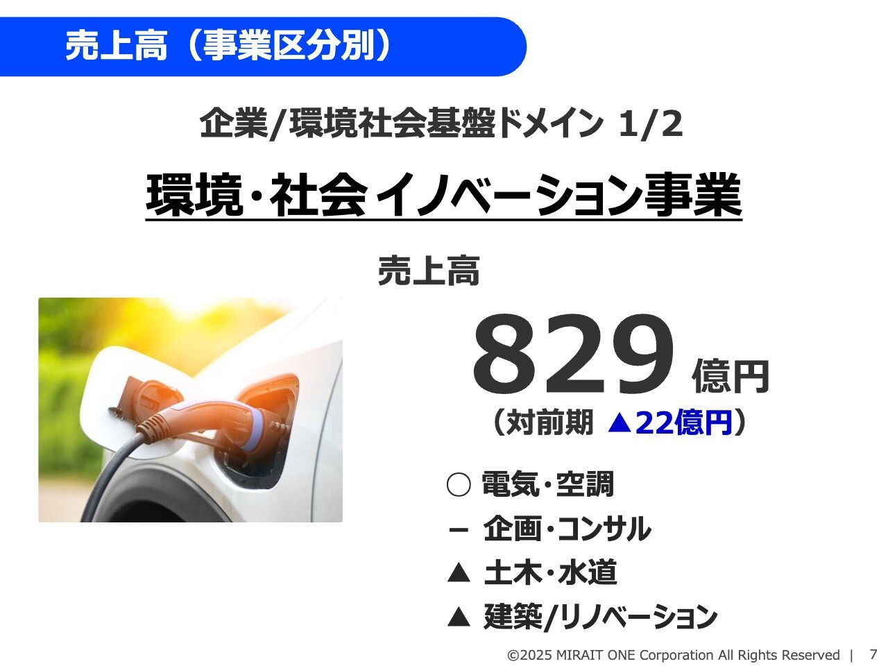 まず、環境・社会イノベーション事業については、受注が好調である一方、今中間期の売上高は前年比22億円減の829億円となりました。