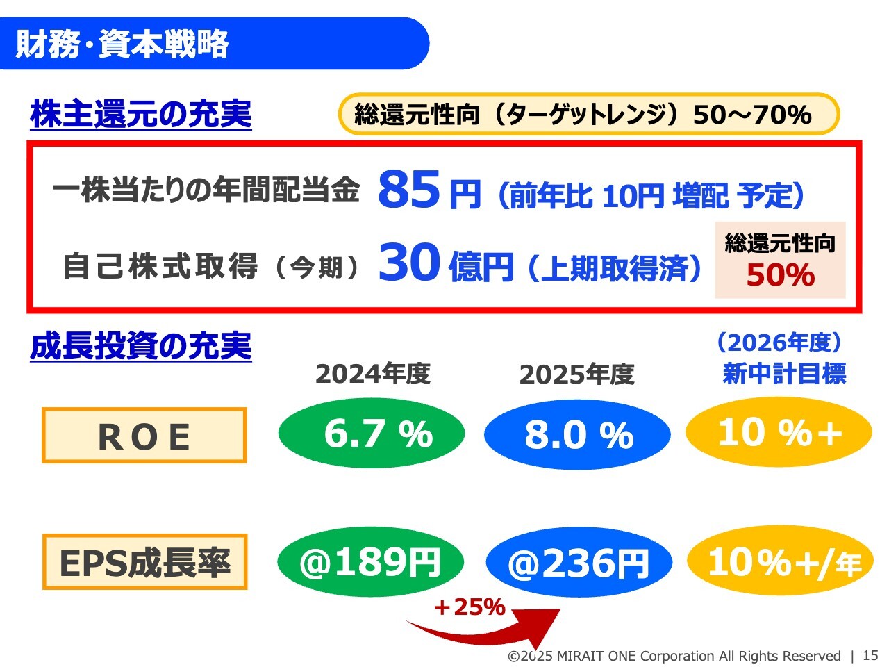 株主還元についてです。今年度も、還元方針は従来同様、安定的な配当成長と機動的な自己株式取得を基本とし、総還元性向は50パーセントから70パーセントをターゲットレンジとして、積極的に実施していく方針は変わりません。