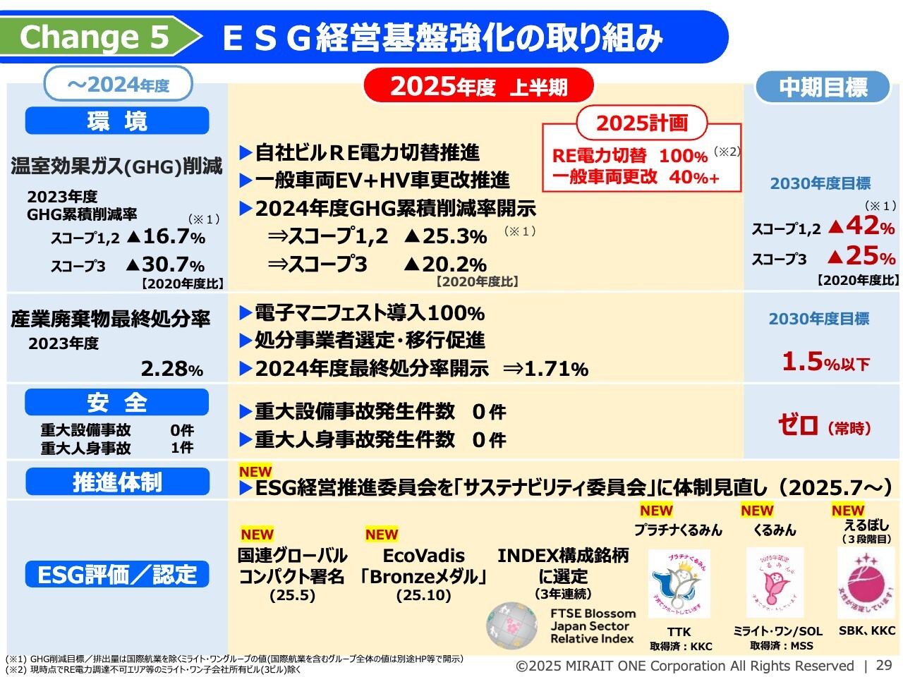 「Change5」ESG経営基盤強化の進捗状況についてです。当社のマテリアリティとして、「環境にやさしく強靭な街づくり・里づくりへの貢献」があります。今年度も環境課題の解決に向け、温室効果ガス(GHG)の削減や産業廃棄物最終処分率低減の取り組みを着実に推進しています。上期については、それぞれの2024年度実績値を開示しました。
