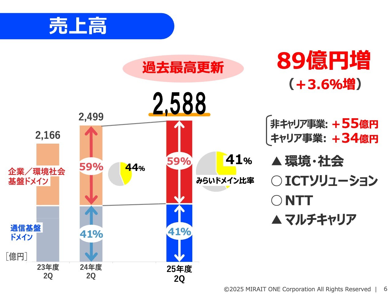 売上高についてです。受注高と同様に、企業/環境社会基盤ドメイン(非キャリア事業)並びに通信基盤ドメイン(キャリア事業)ともに前年比で増収となりましたが、事業区分別では、環境・社会イノベーション事業とマルチキャリア事業が減少しました。全体の売上高は前年比89億円増の2,588億円です。
