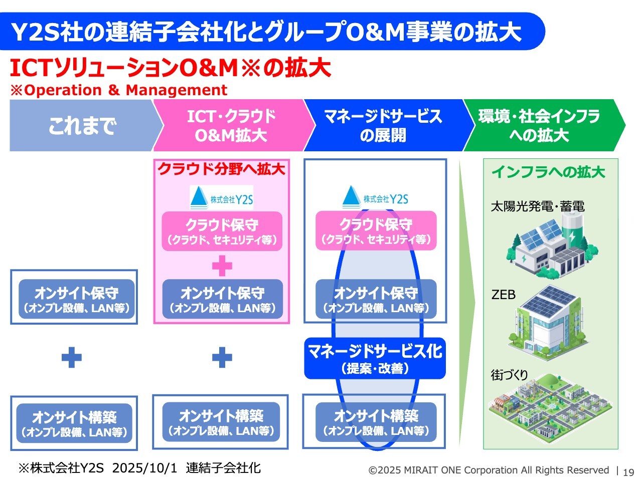 「事業領域の拡大」についてです。その1つとして、Y2S社の連結子会社化によるO&M事業の拡大について簡単にご説明します。これまでミライト・ワングループにおける保守サービスは、主にオンサイト対応を中心に行ってきました。