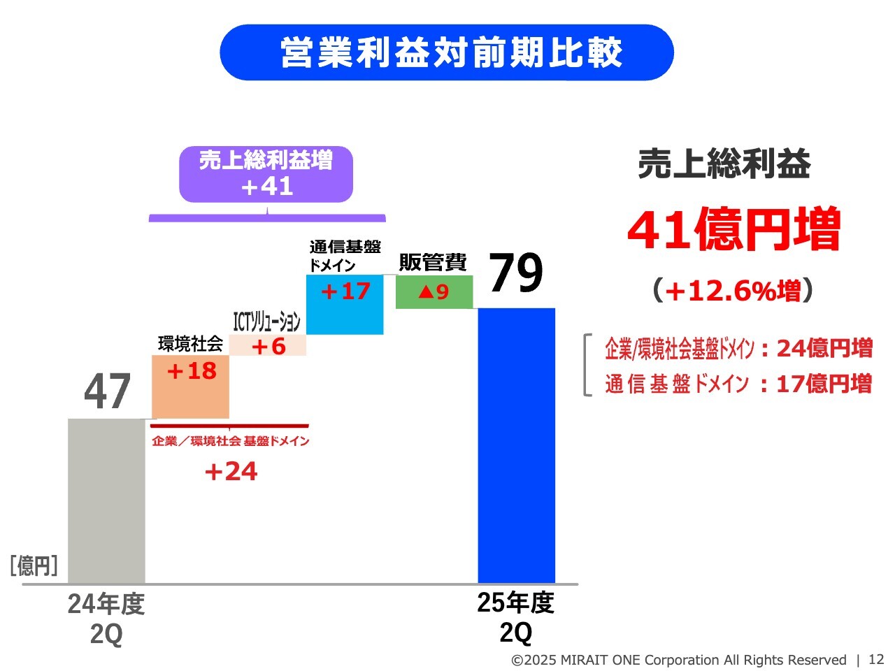 売上総利益は、環境・社会事業で18億円増、ICTソリューション事業で6億円増となり、企業/環境社会基盤ドメイン全体としては前年比で24億円増となりました。また、通信基盤ドメインも17億円増となり、トータルで売上総利益は41億円の増益となっています。