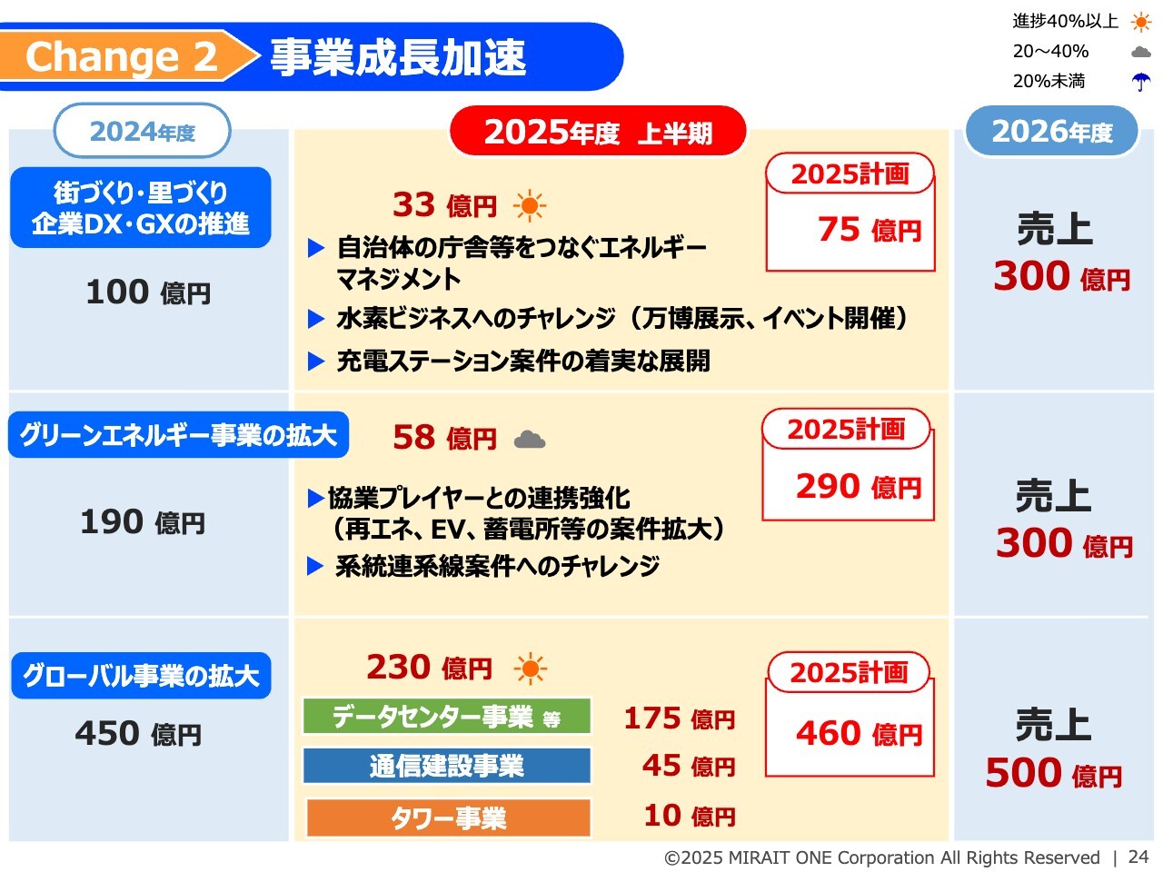 「Change2」事業成長加速についてです。街づくりやグローバル事業は順調に進捗していますが、グリーンエネルギー事業については、売上が下期に多く計上される傾向があることなどから、上半期時点で進捗率は20パーセント程度ですが、EVや蓄電所などの領域にも取り組み、受注は獲得できているため、通期計画の達成に向けて完工の促進を図っていきます。