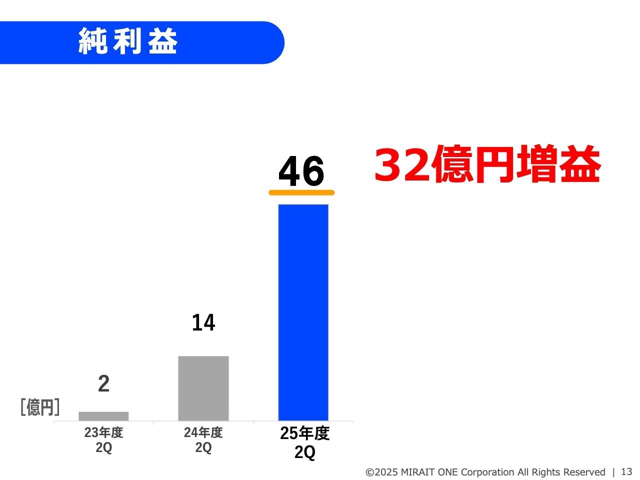 純利益についてです。利益率改善などに伴う営業利益の増加を主因として、純利益は前年の14億円から46億円と、32億円の増益となりました。
