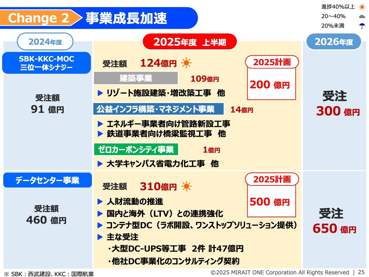 西武建設、国際航業とその他のミライト・ワングループの三位一体によるシナジー効果は、大型リゾート施設の新築や増改築事業など、上半期の受注額は合計124億円となり、すでに昨年度1年間の実績である91億円を超える成果が出ています。引き続き、目標である200億円達成に向けて取り組んでいきます。