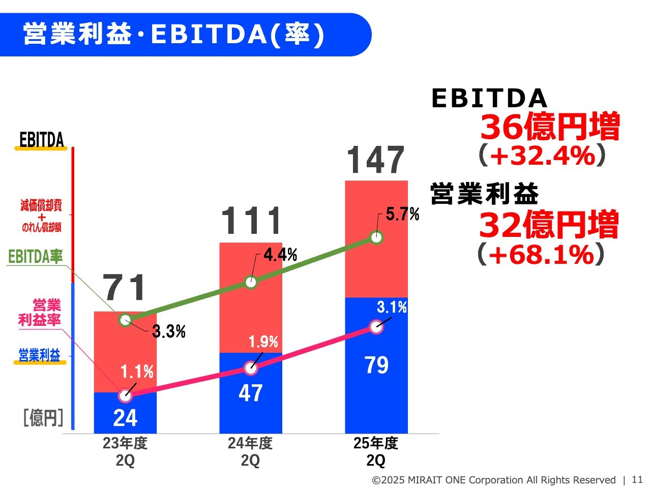 営業利益は、増収に加え、利益率が改善したことなどにより、前年比32億円増の79億円となりました。またEBITDAも、前期の111億円に対し、今中間期は147億円と増加しており、稼ぐ力は着実についてきているものと考えています。