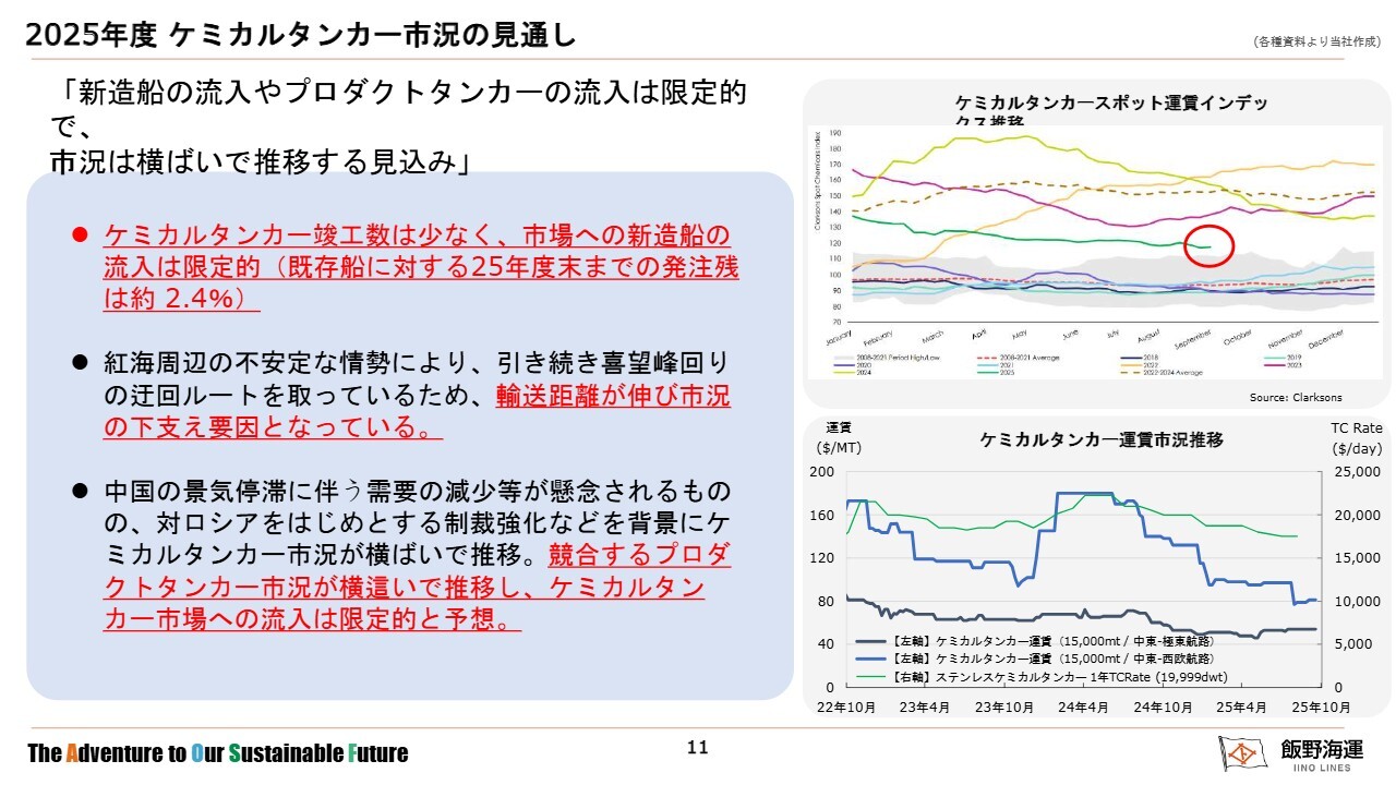 ケミカルタンカーの新造船については、2025年度末までの発注残が約2.4パーセントと引き続き限定的な状況です。また、紅海の航行が現時点ではすぐに再開されない見込みとなっており、喜望峰回りの航行は引き続き船腹需給の引き締め要因になると考えられます。