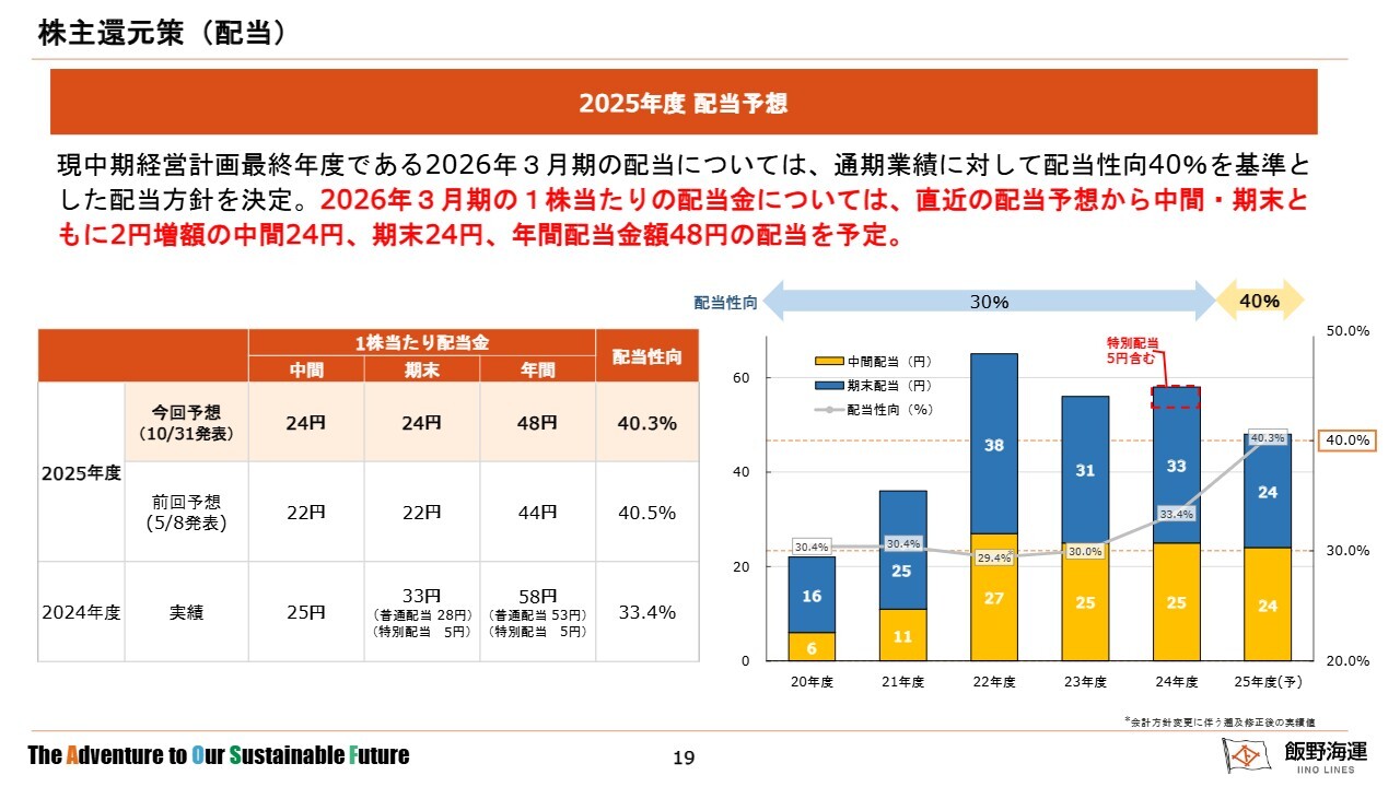 この方針に加え、ご説明の通り今年度の通期業績予想を引き上げたことに伴い、前回7月開示時点から中間および期末ともに2円増額し、通期で48円の配当を予定しています。