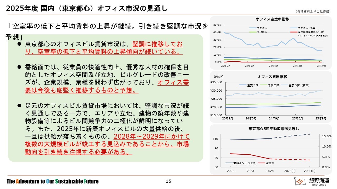 足元では空室率の低下や平均賃料の上昇傾向が続いており、市況は堅調に推移しています。需要面では、人材確保や人的資本の観点から、高品質なビルに対する需要が見られており、オフィス市況は今後も底堅く推移すると予想しています。