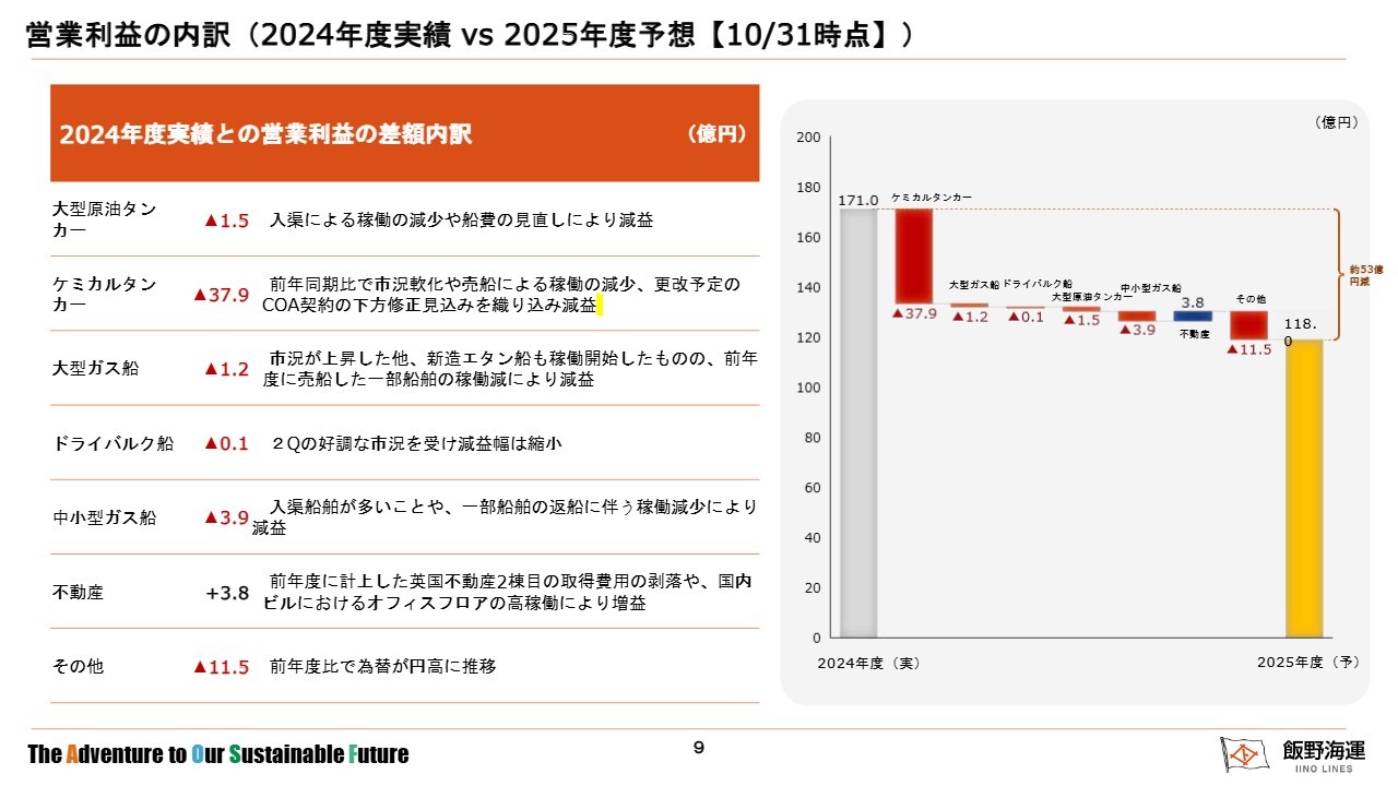 大型ガス船では、先ほどの説明の通り、2隻の大型エタン船竣工のほか、市況が今後も堅調に推移すると予想されることから、通期の市況前提を7月時点から引き上げています。しかしながら、昨年度末に一部の船舶を売船したため、2025年度はその利益分が剥落し、1億円程度の減益を見込んでいます。