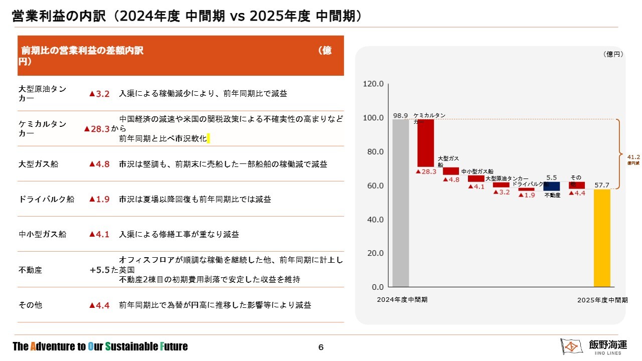 全体としては、当中間期の営業利益は約58億円となり、前年同期比で約41億円の減益となりました。主な減益要因は、主力であるケミカルタンカーによるものです。