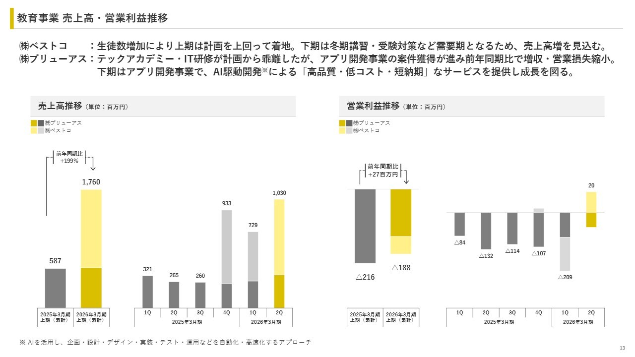 教育事業は、売上高17億6,000万円、営業損失1億8,800万円となりました。株式会社ベストコは計画を上回って進捗しており、下期は需要期となるため、上期比で売上が増加する計画です。