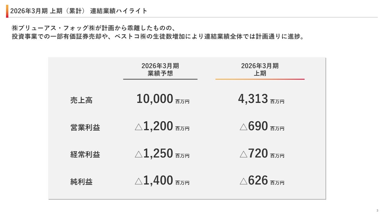 株式会社ブリューアス、フォッグ株式会社の業績が計画から乖離しましたが、一方で、投資事業で有価証券を売却したことや、ベストコ株式会社の生徒数が拡大したというプラス要因により、連結業績全体では計画どおりに進捗しました。