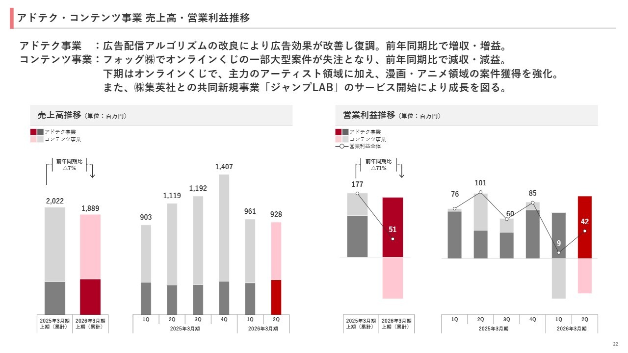 一方、コンテンツ事業では、株式会社フォッグでオンラインくじの一部大型案件が失注となったことで、前年同期比で減収減益となりました。下期は、オンラインくじにおいて主力のアーティスト領域に加え、漫画・アニメ領域の案件獲得を強化していきます。