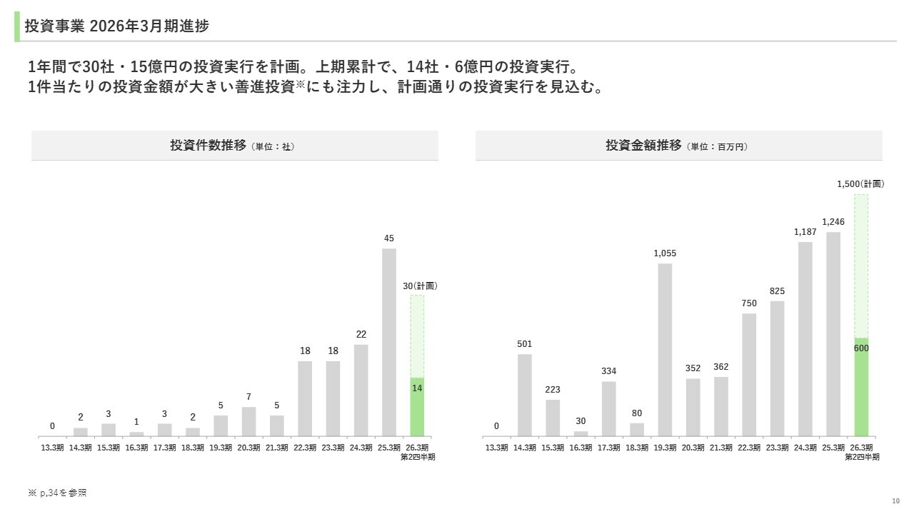 投資実行の進捗状況についてご説明します。1年間で30社、15億円の投資実行を計画しており、上期累計では14社、6億円の投資を実行しました。また、1件当たりの投資金額が大きい善進投資にも注力し、計画どおりの投資実行を見込んでいます。